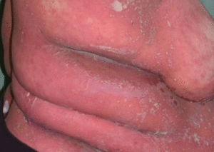 • Peradangan (kemerahan, pembengkakan, nyeri tekan, gatal) berkembang pada awalnya, biasanya di area lipatan kulit yang besar.