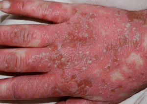 2. Kemerahan yang luas atau sistemik disertai dengan beberapa pustula steril yang dapat menyatu menjadi danau nanah