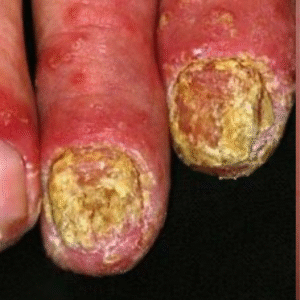 • Lubang tidak teratur dan onikolisis kuku jari – perhatikan pita kuning di dekat onikolisis