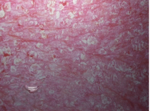 • Plak berbatas tegas dengan sisik keperakan pada psoriasis plak kronis