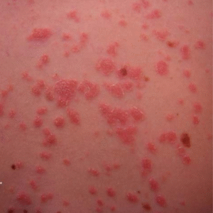 Rasa gatal umumnya ringan, tetapi bisa parah pada beberapa pasien, menyebabkan garukan dan likenifikasi yang ditandai dengan penebalan kulit dan peningkatan tanda-tanda pada kulit. Retakan atau fisura kulit yang menyakitkan dapat terjadi, terutama pada telapak tangan dan telapak kaki.