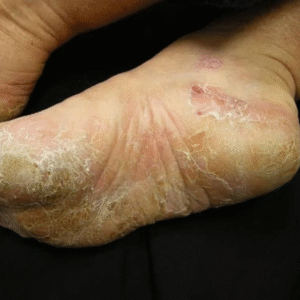• Hiperkeratosis pada telapak kaki dan tumit akibat psoriasis – fisura yang menyakitkan sering menjadi masalah”